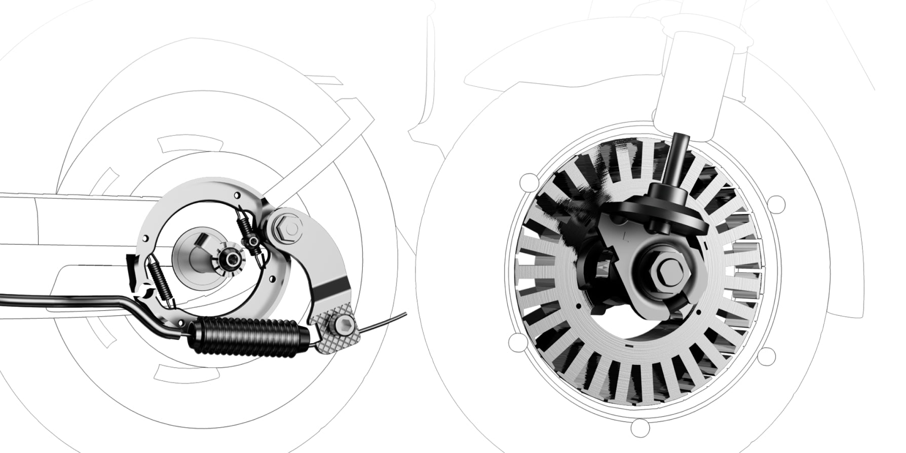 The combination of the front electronic brake and the rear mechanical drum brake (controlled by a brake lever) ensures an efficient and reliable stop.